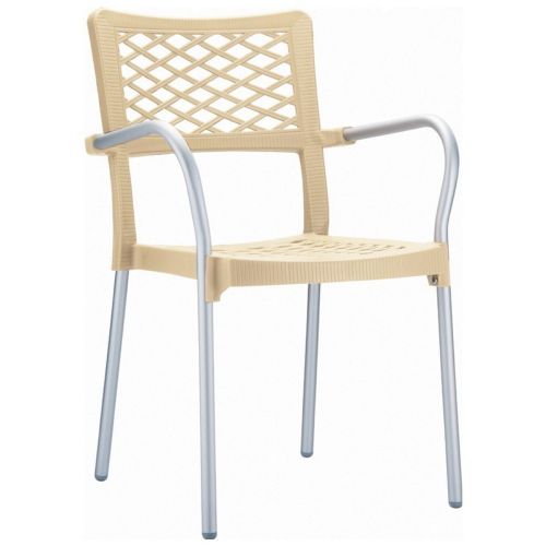 Bella stacking outdoor chair is great for heavy use areas and restaurants. Outdoor chair has resin seat with anodized aluminum structure. Strong and durable. Stacks 10. Width between arms: 18". Arm Height: 27". Color: Beige.