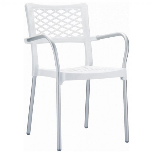 Bella stacking outdoor chair is great for heavy use areas and restaurants. Outdoor chair has resin seat with anodized aluminum structure. Strong and durable. Stacks 10. Width between arms: 18". Arm Height: 27". Color: White. Certified for strict European standards by CATAS Italian research institute and test laboratory.