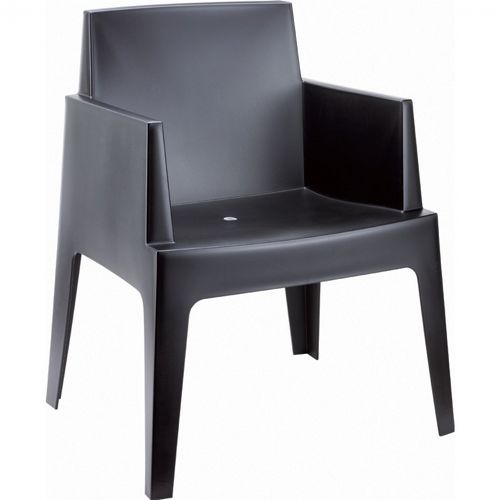 Box black resin outdoor dining chair. Box chair features strong and stable frames with commercial grade resin polypropylene construction. Made from recyclable resin. Box resin stacking chairs are perfect for heavy use areas, patios, balconies, poolsides. Resin chair is resitant to UV, suntan oils, saltwater and chlorine. Great pool side chair. Color black. Certified for strict European standards by CATAS Italian research institute and test laboratory.