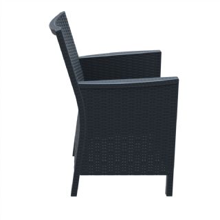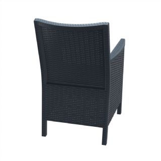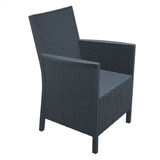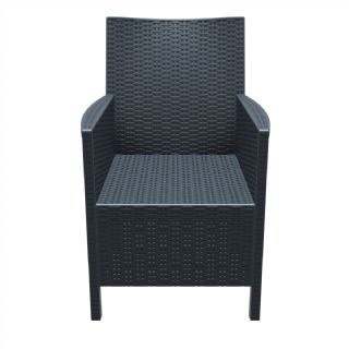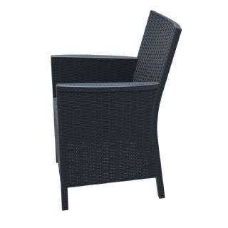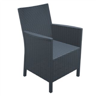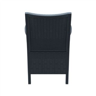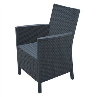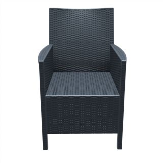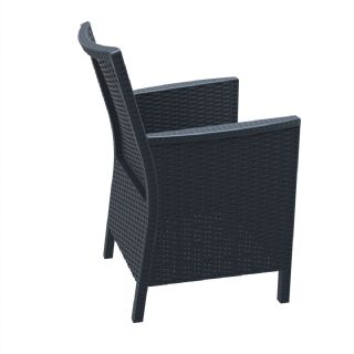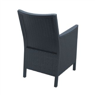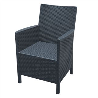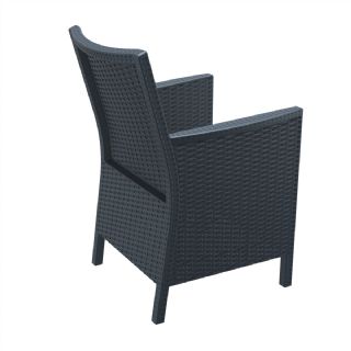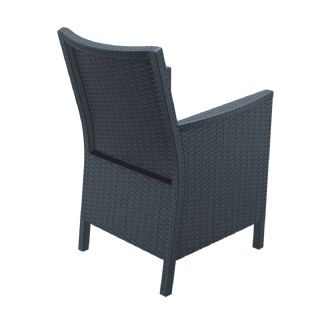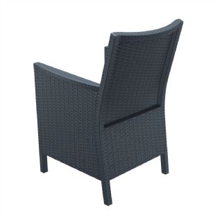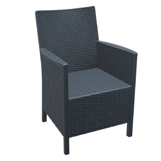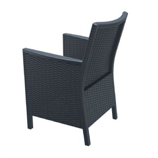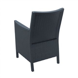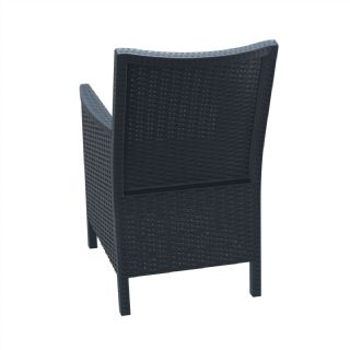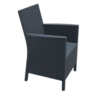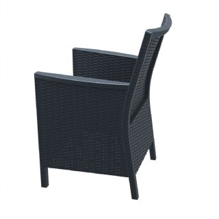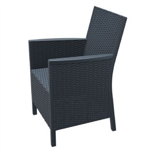 California Wickerlook resin patio dining arm chair with cushion. Dining height chair can also be used as accent chairs on a balcony or patio. This is a heavy and strong dining chair with massive molding construction with 23 lbs. weight. Unlike any other woven furniture in the market Wickerlook furniture will never unravel. No metal parts to rust, no moving parts that can break. Made for commercial durability. Perfect for home use or hotels and restaurants. UV treated. Hose down for cleaning. Withstands outdoor temperatures summer and winter. Certified for strict European standards by CATAS Italian research institute and test laboratory.