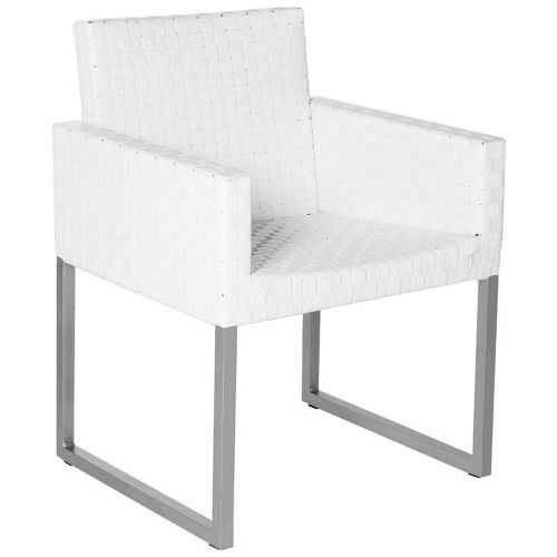 Tidelli Cube dining arm chair. Modern and clean design with wide weave. Hand finished aluminum tubing with synthetic Ti-Flex wicker. Frame resistant to outdoors. Wicker Ti-Flex available in high gloss colors. Frame in silver color.
