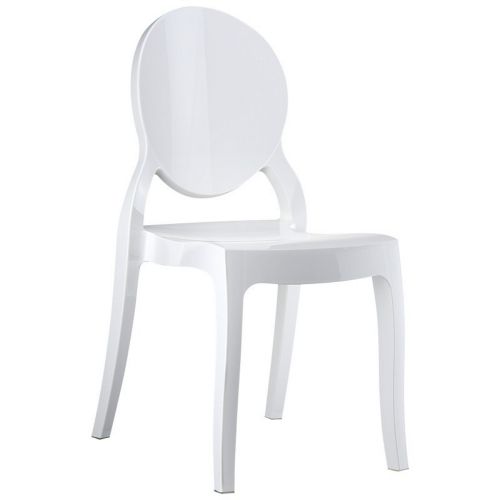 Elizabeth glossy polycarbonate indoor outdoor bistro chair. Modern contemporary design. Can be used both indoors and outdoors. Scratch resistant. Commercial grade plastic polycarbonate resin. Strong legs and structure. Self extinguish fire rated V2. Stackable. UV resistant. Very elegant. Color: Glossy White. Certified for strict European standards by CATAS Italian research institute and test laboratory.