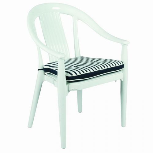 Triconfort Elysee outdoor dining armchair. Lacquered resin. Elegant and decorative. Great for deck, poolside, patio or boats. Available in white lacquered resin. Stackable. Seat cushion sold separately. Frame Color: White lacquered resin.