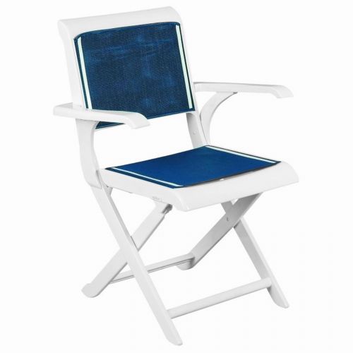 Triconfort Elysee outdoor folding arm chair. Lacquered resin and mesh folding arm chair. Available in 4 color combinations. Great for deck, pool area, boats and yachts. Cushions sold separately. Cushions available in 5 colors. Frame Color: White lacquered resin.