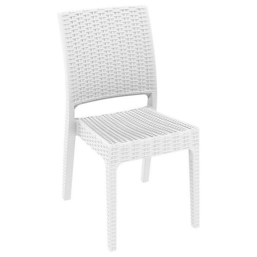 Florida Wickerlook resin patio dining chair white. Wickerlook resin is a natural looking un-woven one piece furniture technology. Wickerlook patio furniture is made with open weave design that resembles traditional woven wicker furniture. Unlike any other woven furniture in the market Wickerlook furniture will never unravel. No metal parts to rust, no moving parts that can break. Made for commercial durability. Chairs are stackable. Perfect for heavy use areas such as hotels and restaurants. UV treated. Hose down for cleaning. Withstands outdoor temperatures summer and winter. Certified for strict European standards by CATAS Italian research institute and test laboratory.