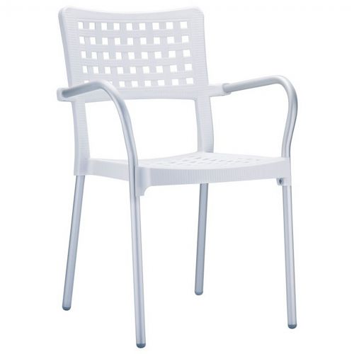 Gala stacking outdoor chair is great for heavy use areas and restaurants. Outdoor chair has resin seat with anodized aluminum structure. Strong and durable. Stacks 10. Width between arms: 18". Arm Height: 27". Color: White. Certified for strict European standards by CATAS Italian research institute and test laboratory.