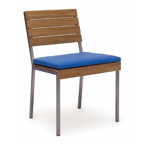 Grace outdoor dining side chair with seat cushion. Strong stainless steel and grade A teak structure with two inch Sunbrella seat cushions. Dining chair is made of high quality natural teak over stainless steel frames. Stainless steel won't chip, flake or scratch. Perfect for outdoors and patio. Cushions are made of Sunbrella fabric and available in multiple colors. Cushion included in price. Teak is natural and requires oiling periodically.