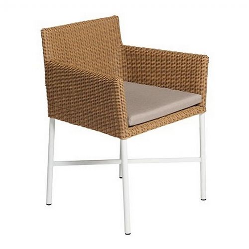 Hardy outdoor dining arm chair from Triconfort. Offers five star luxury. Contemporary and modern outdoor furniture design. Made from synthetic outdoor wicker over aluminum tubing. Maintenance free. Very strong. Can be washed down with water. Totally outdoor resistant. Cushions are made from Sunbrella fabric and durable for outdoor use. Cushions included.