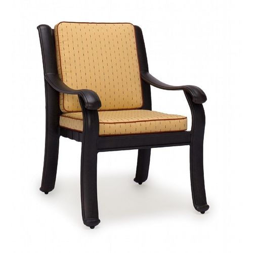 Jordan cast aluminum outdoor dining armchair with seat and back cushion. Traditional country club style luxurious furniture. Strong cast aluminum structure with warm antique finish. Dining chair is made of high quality cast aluminum and is triple polished with a powder coated paint and an antique finish. Cast aluminum won't chip, flake or scratch. Perfect for outdoors. Color: Desert Bronze. Cushions are made of Sunbrella fabric and available in multiple colors. Cushion included in price.