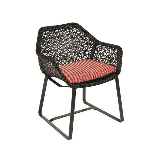 Maia outdoor chair with seat cushion from Kettal. Contemporary designer outdoor collection. Maia outdoor chair is a full aluminum frame with wicker weave. Modern and sleek design. Available in chestnut or white frames. Cushions available in designer fabrics. Cushion included.