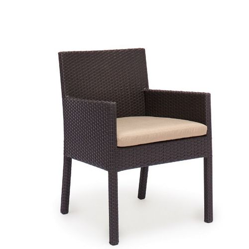 Maxime outdoor wicker dining arm chair from Caluco. Bold geometric design. Made for comfortable outdoor dining. Plush and thick Sunbrella cushions. Made from Viro outdoor wicker over strong aluminum frames. Maintenance free. Can be washed down with water. Totally outdoor resistant. Viro outdoor wicker is handbraided and highly resistant to fading, cracking or mildew. Cushions are made from Sunbrella fabric and durable for outdoor use. Seat cushion included. Wicker available in Espresso only.