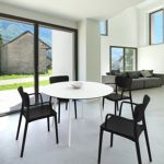 Maya black resin outdoor dining chair. Made from commercial grade resin with gas injection molded legs. Features pastel colors. So elegant that it is suitable for indoors, so durable that it is used outdoors. Maya resin stacking chairs are perfect for heavy use areas. Great for outdoor spaces. Preferred by yogurt shops, outdoor cafes, ice cream shops, outdoor restaurants and hotels. Chairs are stackable, easy cleaning and UV resistant. Made for outdoor use. Sold in sets of 2. Price shown is for 1 chair. Color black. Certified for strict European standards by CATAS Italian research institute and test laboratory.