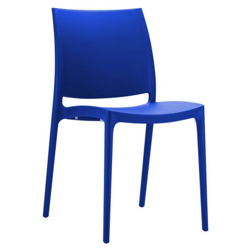 Maya dark blue resin outdoor dining chair. Made from commercial grade resin with gas injection molded legs. Features pastel colors. So elegant that it is suitable for indoors, so durable that it is used outdoors. Maya resin stacking chairs are perfect for heavy use areas. Great for outdoor spaces. Preferred by restaurants, cafes and hotels. Chairs are stackable, easy cleaning and UV resistant. Made for outdoor use. Sold in sets of 2. Price shown is for 1 chair.