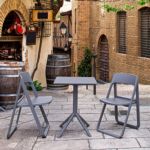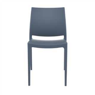 Maya dark gray resin outdoor dining chair. Made from commercial grade resin with gas injection molded legs. Features pastel colors. So elegant that it is suitable for indoors, so durable that it is used outdoors. Maya stackable resin chairs are perfect for heavy use areas. Great for outdoor spaces. Preferred by yogurt shops, outdoor cafes, ice cream shops, outdoor restaurants and hotels. Chairs are stackable, easy cleaning and UV resistant. Made for outdoor use. Sold in sets of 2. Price shown is for 1 chair. Color dark gray. Certified for strict European standards by CATAS Italian research institute and test laboratory.