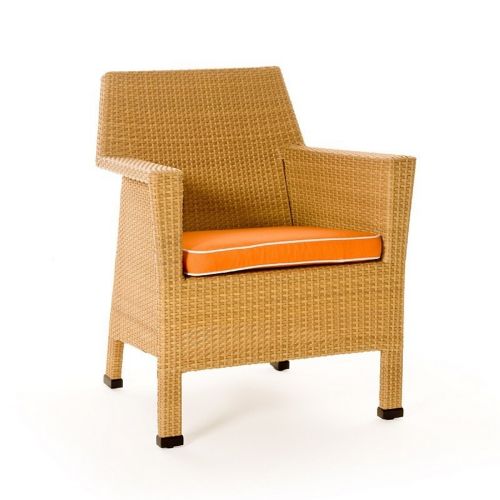 Mayan outdoor wicker dining arm chair from Caluco. Contemporary and modern outdoor furniture design. Perfect for dining outdoors. Made from Viro outdoor wicker over strong extruded powder coated aluminum frame. Maintenance free. Can be washed down with water. Totally outdoor resistant. Cushions are made from Sunbrella fabric and durable for outdoor use. Seat cushions included. Wicker available in Wheat only. Cushions are 2 inch thick.