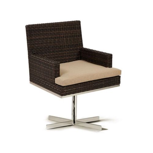 Mirabella modern wicker rocker dining chair with cushion from Caluco. Stunning contemporary design with bold angles and sleek polished stainless steel frames. Made from Viro outdoor wicker over strong stainless steel frame. Can be washed down with water. Totally outdoor resistant. Cushions are made from Sunbrella fabric and durable for outdoor use. Cushions included. Wicker available in Dark Brown only.