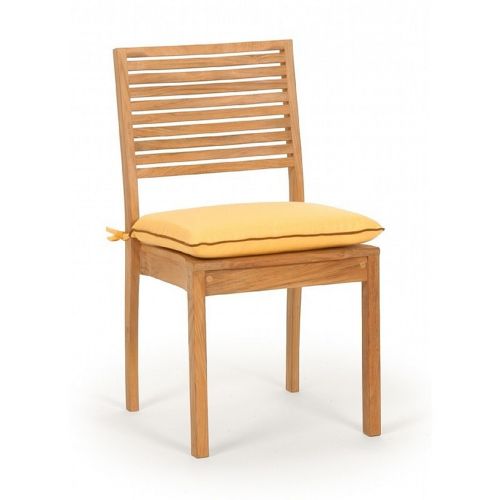 Modern teak patio dining chair with cushion. Made with kiln-dried, grade a teak wood. Modern and simple design. Teak wood is natural and suitable for outdoors. Requires regular teak wood maintenance. Chairs come assembled. Cushions are made of Sunbrella fabric and available in multiple colors. Seat cushions are 2 inch thick. Seat cushions included in price.