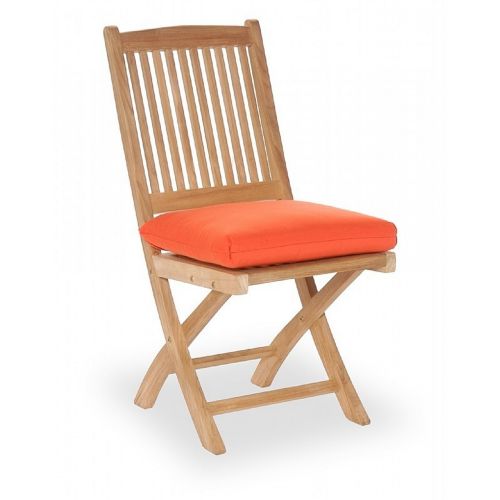 Modern teak patio folding side chair with cushion. Made with kiln-dried, grade a teak wood. Folds for easy storage. Modern and simple design. Teak wood is natural and suitable for outdoors. Requires regular teak wood maintenance. Chairs come assembled. Cushions are made of Sunbrella fabric. Cushions available in multiple colors. Seat cushions are 2 inch thick. Price includes seat cushion.