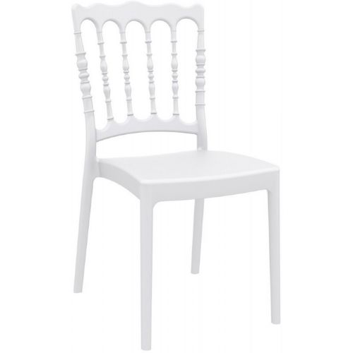 Siesta LogoNapoleon dining-high wedding chair. Classic design. Made from commercial grade resin with gas injection molded legs. So elegant that it is suitable for indoors, so durable that it is used outdoors. Great for outdoor spaces. Chairs are stackable, easy cleaning and UV resistant. Made for outdoor use but can be used indoors. Preferred by weddings, parties, birthdays. Certified for strict European standards by CATAS Italian research institute and test laboratory.