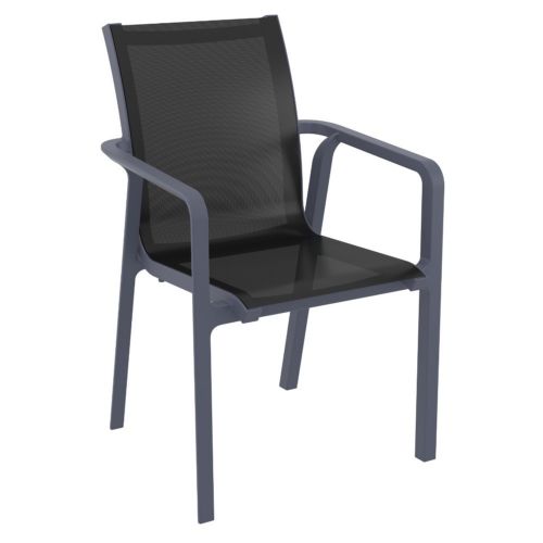Pacific resort quality dining arm chair. Simple sleek design with commercial strength. Sling is made with Serge Ferrari mesh fabric. Chair is very comfortable and no need for cushions. Stacks for easy storage. Frame made of marine grade resin polypropylene. Extremely durable and comfortable. Commercial grade.