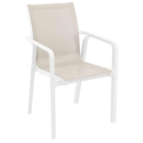 Siesta LogoPacific resort quality dining arm chair. Simple sleek design with commercial strength. Sling is made with Serge Ferrari mesh fabric. Chair is very comfortable and no need for cushions. Stacks for easy storage. Frame made of marine grade resin polypropylene. Extremely durable and comfortable. Commercial grade.