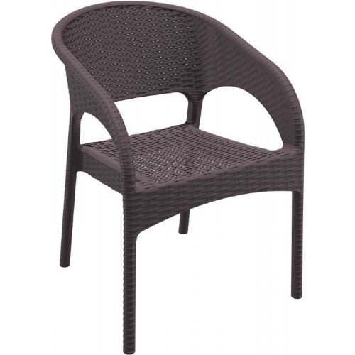 Panama Wickerlook resin patio dining armchair. New round back design. Wickerlook resin is a natural looking un-woven one piece furniture technology. Wickerlook patio furniture is made with open weave design that resembles traditional woven wicker furniture. Unlike any other woven furniture in the market Wickerlook furniture will never unravel. No metal parts to rust, no moving parts that can break. Made for commercial durability. Chairs are stackable. Perfect for heavy use areas such as hotels and restaurants. UV treated. Hose down for cleaning. Withstands outdoor temperatures summer and winter. Certified for strict European standards by CATAS Italian research institute and test laboratory.