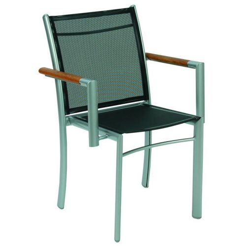 Triconfort Rivage lacquered aluminum outdoor dining armchair with oiled teak armrests. Luxury meets outdoors. Very elegant and aesthetic. Highest end aluminum outdoor furniture in the market. Outdoor dining armchair is painted in the same manner as a luxury car. Multiple coatings of lacquer create superior outdoor protection and sleek looks. Great choice for pool side, boats and yachts. Seat and back in porotex mesh for extra comfort. High quality. 100% outdoors resistant. Light and comfortable. Available in 3 color combinations. Chairs are stackable.