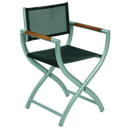 Triconfort Rivage lacquered aluminum director's chair with oiled teak armrests. Style and luxury meets outdoors. Rivage collection is the highest end aluminum outdoor furniture in the market. Director's chair is painted in the same manner as a luxury car. Multiple coatings of lacquer create superior outdoor protection and sleek looks. Very elegant and aesthetic. Great luxury choice for pool side, boats and yachts. Seat and back in porotex mesh for extra comfort. Folds very easily. Easy to store. High quality. 100% outdoors resistant. Light and comfortable. Available in 3 colors.