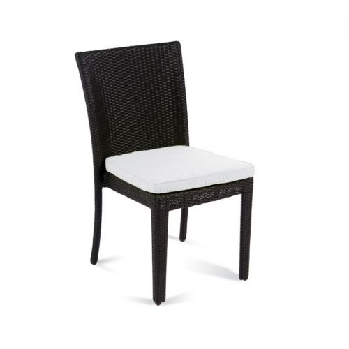 Senna outdoor wicker dining chair from Kannoa. Modern design features sturdy aluminum frames covered with flat all weather wicker. Resistant to harsh outdoor conditions. Outdoor wicker is sleek and modern. Great choice for garden and patio dining. Two inch cushion is available in natural color. Cushion included. Wicker available in espresso or white.