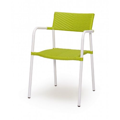 Terry outdoor dining chair with Viro wicker over aluminum tubing. Simple and modern design. Extremely durable with UV-protected weather-resistant VIRO fiber hand-woven over aluminum frames. White frames with green weave. Suitable for commercial use. Outdoor wicker withstands harsh weather conditions. Just hose it down for cleaning.
