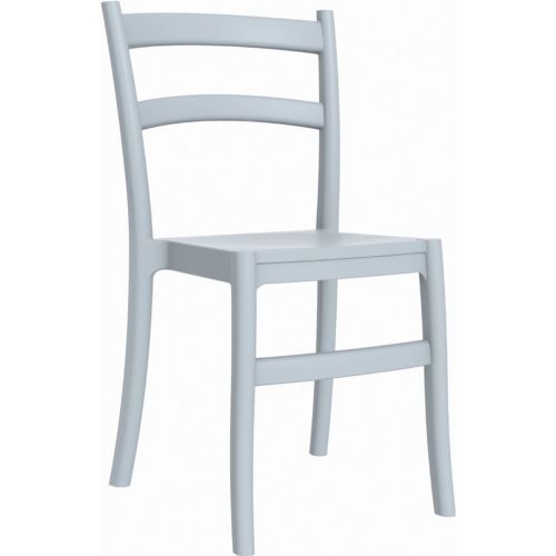 Tiffany cafe style silver gray resin outdoor dining chair. Tiffany chair features classic wooden cafe chair looks with commercial grade resin polypropylene construction. Made from resin with gas injection molded legs. Features pastel colors. So elegant that it is suitable for indoors, so durable that it is used outdoors. Tiffany resin stacking chairs are perfect for heavy use areas. Great for outdoor spaces. Preferred by restaurants, cafes and hotels. Plastic resin chairs are stackable. Sold in sets of 2. Price shown is for 1 chair. Color silver gray. Certified for strict European standards by CATAS Italian research institute and test laboratory.