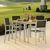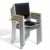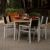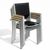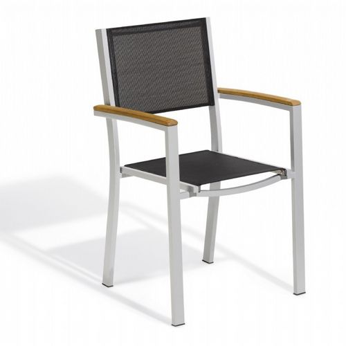 Travira sling dining chair from Oxford Garden. Classic yet sleek look. Lightweight aluminum frames combined with the sling seats and backs move and stack easily. Sculpted wood armcaps of teak add contrast and warmth. Leg endcaps provide protection from marring and scratching of surfaces. Durable aluminum powder coated frames resist weathering. Sling available in black.
