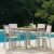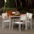 Travira sling dining chair from Oxford Garden. Classic yet sleek look. Lightweight aluminum frames combined with the sling seats and backs move and stack easily. Sculpted wood armcaps of add contrast and warmth. Leg endcaps provide protection from marring and scratching of surfaces. Durable aluminum powder coated frames resist weathering. Sling available in natural white.