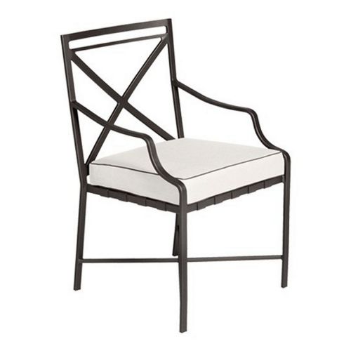 1950 outdoor dining arm chair from Triconfort. Offers contemporary design with five star luxury. Aluminum frames with thick luxurious cushions. Maintenance free. Very strong. Can be washed down with water. Totally outdoor resistant. Exceptional aluminum craftsmanship. 3.5 inch Sunbrella cushions.