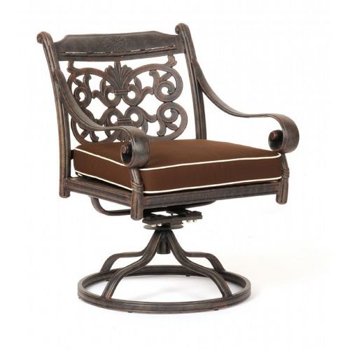 Victoria cast aluminum garden swivel chair with seat cushion. Traditional English garden design cast aluminum dining furniture. Collection items provide spacious proportions. Strong cast and tubular frames come with four inch Sunbrella seat cushions. Aluminum is powder coated so it won't chip, fade, or scratch. Desert bronze color frames gives a traditional aged look. Perfect for outdoors. Cushions are made of Sunbrella fabric and available in multiple colors. Cushion covers can be machine washed. Cushion included in price. Frame color: Desert Bronze.
