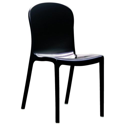 Victoria glossy plastic black indoor outdoor bistro chair. Modern contemporary design. Can be used both indoors and outdoors. Scratch resistant. Commercial grade plastic polycarbonate resin. Strong legs and structure. Stackable. Very elegant. Color: Glossy Black.