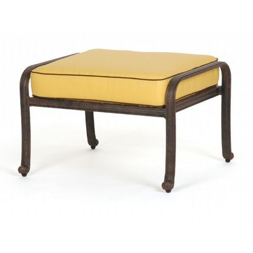 Florence cast aluminum outdoor ottoman with Sunbrella cushion. Traditional Mediterranean design garden deep seating ottoman. Suitable with club chairs and deep seating groups. Strong cast aluminum structure with four inch Sunbrella seat cushions. Outdoor ottoman is made of high quality cast aluminum and is triple polished with a powder coated paint and an antique finish. Cast aluminum won't chip, flake or scratch. Perfect for outdoors, garden and patio. Color: Desert Bronze. Cushions are made of Sunbrella fabric and available in multiple colors. Cushion included in price.