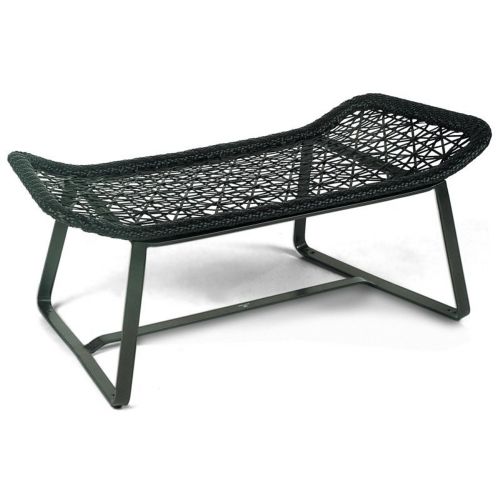 Maia outdoor ottoman with full cushion from Kettal. Contemporary designer outdoor collection. Maia outdoor ottoman complements Maia outdoor chairs. Ottoman is a full aluminum frame with wicker weave and porotex mesh cushions. Available in chestnut and white frames. Cushions available in white, gray and orange. All cushions are made from padded mesh material. Cushion included.