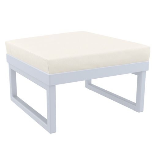 Mykonos resin ottoman with 100% acrylic natural cushion. Modular contemporary design with commercial strength. Made from commercial grade polypropylene resin. Perfect for heavy use areas. Casual and modern design makes it suitable for indoors and outdoors. Cushions are made with 100% acrylic fabric with 4 inch thick high density foam. Polypropylene frame resists sun, oils, chlorine and all outdoor conditions.