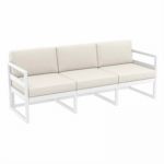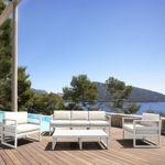 Mykonos white resin ottoman with 100% acrylic natural cushion. Modular contemporary design with commercial strength. Made from commercial grade polypropylene resin. Perfect for heavy use areas. Casual and modern design makes it suitable for indoors and outdoors. Cushions are made with 100% acrylic fabric with 4 inch thick high density foam. Polypropylene frame resists sun, oils, chlorine and all outdoor conditions.