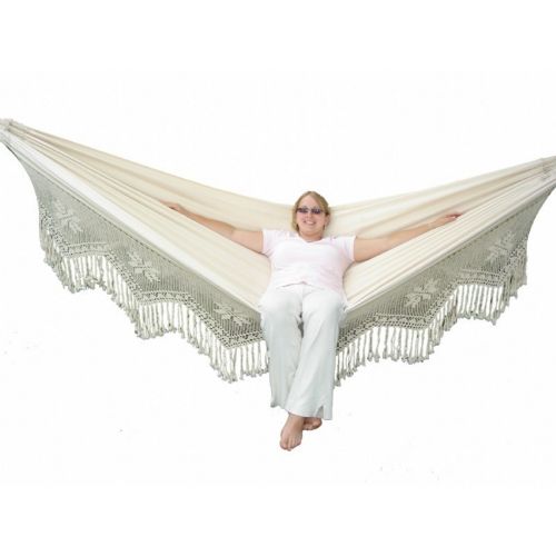 Brazilian Style Double Deluxe Hammock. The Brazilian hammocks offer an ultimate form of comfort and relaxation with a little more room for more than one person.This double deluxe Brazilian style hammock is truly a hidden gem. This hammock is complimented by an elegant hand crocheted fringe that would make anyone feel like royalty.It has a comfort, style and class with an excellent addition to any backyard or cottage. These hammocks are tightly woven with high quality cotton thread to prevent colors from running. It is a natural choice for a Caribbean experience. The Brazilian hammocks come without a spreader bar. They are both hand and machine washable. The stands for Brazilian hammocks are sold separately. The stands to use for Brazillian hammocks are either UHS9 (Universal Hammock Stands in different colors) or EFHTS (Vivere Eco-Friendly Hammock Tree Straps) available for different styling and standing for the Brazilian hammocks on this website.