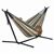 Vivere's Combo - Double Desert Moon Hammock with Stand. The universal hammock stand with double hammock is our top choice for combos. The double hammock is made with 100% cotton, creating a comfortable refuge for an afternoon snuggle. The hammock stand is constructed of heavy duty steel and assembles in minutes without any tools. Its plastic caps are used on the ends of the steel tubing to create a soft finish. You will enjoy the freedom the stand provides by allowing you to set up your hammock in the most convenient location and no longer rely on those 2 perfect trees.