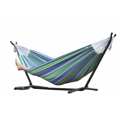 Vivere's Combo - Double Oasis Hammock with Stand. The universal hammock stand with double hammock is our top choice for combos. The double hammock is made with 100% cotton, creating a comfortable refuge for an afternoon snuggle. The hammock stand is constructed of heavy duty steel and assembles in minutes without any tools. Its plastic caps are used on the ends of the steel tubing to create a soft finish. You will enjoy the freedom the stand provides by allowing you to set up your hammock in the most convenient location and no longer rely on those 2 perfect trees.