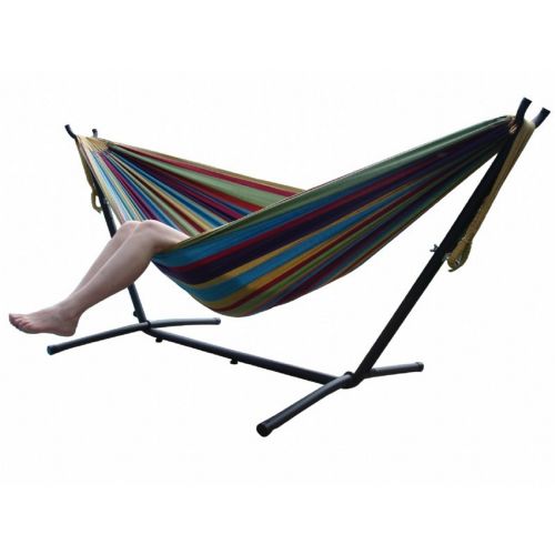 Vivere's Combo - Double Tropical Hammock with Stand. The universal hammock stand with double hammock is our top choice for combos. The double hammock is made with 100% cotton, creating a comfortable refuge for an afternoon snuggle. The hammock stand is constructed of heavy duty steel and assembles in minutes without any tools. Its plastic caps are used on the ends of the steel tubing to create a soft finish. You will enjoy the freedom the stand provides by allowing you to set up your hammock in the most convenient location and no longer rely on those 2 perfect trees.