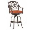 Florence cast aluminum outdoor swivel bar high set with two barstools and one 48 inch round table. Strong cast aluminum structure with two inch Sunbrella seat cushions. Bar set is made of high quality cast aluminum and is triple polished with a powder coated paint and an antique finish. Cast aluminum won't chip, flake or scratch. Perfect for outdoors. Table has a 1.97 inch umbrella hole suitable for most umbrellas. Plastic foot levelers included for easy leveling on uneven surfaces. Color: Desert Bronze. Cushions are made of Sunbrella fabric and available in multiple colors. Cushion included in price.