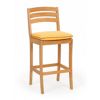 Modern teak patio bar set with two bar chairs and a round bar table. Bar chairs have seat cushions. Made with kiln-dried, grade a teak wood. Bar height seating. Modern and simple design. Teak wood is natural and suitable for outdoors. Requires regular teak wood maintenance. Chairs come assembled. Cushions are made of Sunbrella fabric. Cushions available in multiple colors an included in price. Seat cushions are 2 inch thick.