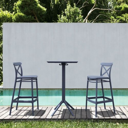 Bar height set with a 24 inch bar table and two bar stools. Folding top table is made with marine grade polypropylene with the latest generation of air moulding thermoplastic legs. Barstools are made of durable weather resistant polypropylene reinforced with glass fiber. Made for commercial durability. Perfect for heavy use areas such as hotels and restaurants. UV Treated. Hose down for easy cleaning. Withstands outdoor temperatures in summer and winter.