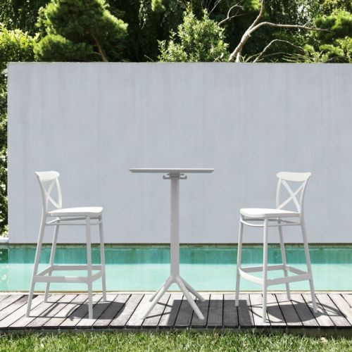 Bar height set with a 24 inch bar table and two bar stools. Folding top table is made with marine grade polypropylene with the latest generation of air moulding thermoplastic legs. Barstools are made of durable weather resistant polypropylene reinforced with glass fiber. Made for commercial durability. Perfect for heavy use areas such as hotels and restaurants. UV Treated. Hose down for easy cleaning. Withstands outdoor temperatures in summer and winter.