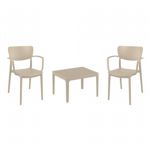 Taupe bar height set with a 24 inch bar table and two bar stools. Folding top table is made with marine grade polypropylene with the latest generation of air moulding thermoplastic legs. Barstools are made of durable weather resistant polypropylene reinforced with glass fiber. No metal parts to rust, no moving parts to break. Made for commercial durability. Barstools are stackable. Perfect for heavy use areas such as hotels and restaurants. UV Treated. Hose down for easy cleaning. Withstands outdoor temperatures in summer and winter.