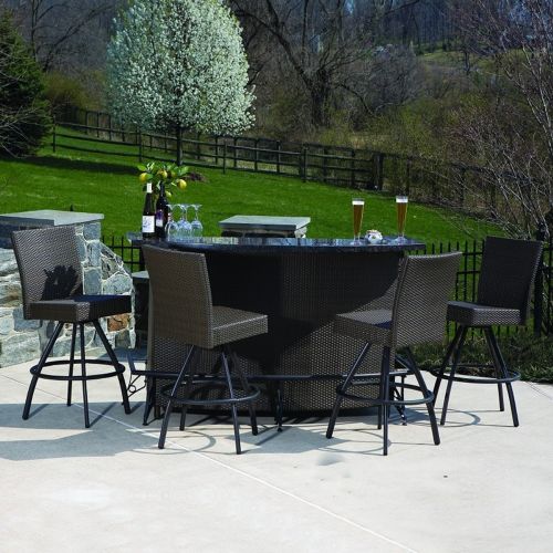 Vento bar high set with four swivel bar chairs and a granite top bar. Features sturdy aluminum frames covered with all weather wicker. Resistant to harsh outdoor conditions. Dark chocolate wicker is sleek and modern. Great choice for poolside, patio or deck. Bar has a shelf and a closed cabinet. Bar has granite top and granite shelf.